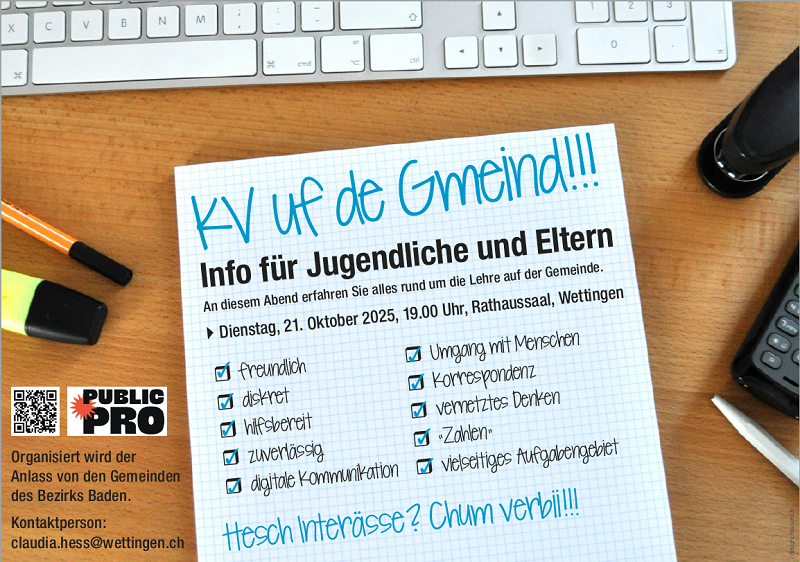 Vielleicht ist eine Lehre auf der Gemeindeverwaltung ja genau dein Ding! Am Dienstag, 21. Oktober 2025, um 19.00 Uhr, findet im Rathaussaal in Wettingen ein spannender Infoabend zur KV-Lehre auf der Gemeinde statt. Du erhältst einen Einblick in die spannenden Aufgaben einer Gemeinde und erfährst, wie die Ausbildung abläuft.