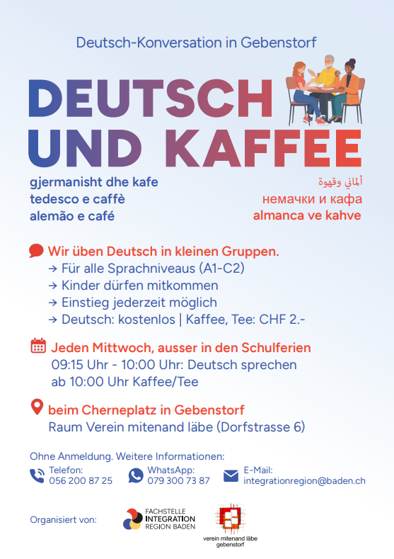 «Deutsch und Kaffee» und ist ein gemeinsames Projekt des Vereins «mitenand läbe» und der Fachstelle Integration Region Baden. Jeden Mittwochmorgen, ausser in den Schulferien, organisiert der Verein «mitenand läbe» in Gebenstorf das «Kafi mitenand». An der Dorfstrasse 6 beim Cherneplatz treffen sich Gebenstorfer*innen zum gemütlichen Austausch.